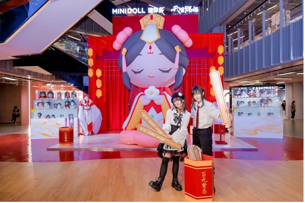此外,《天官賜福》主角謝憐與花城氣模亮相户外高區露台,商場一層中庭謝憐“太子悦神”氣模與絕版的歷代玩偶產品展示櫃,這些趣味內容形成一條導覽動線,從外場延伸到室內展區,引領客流深入、激發探索欲。
