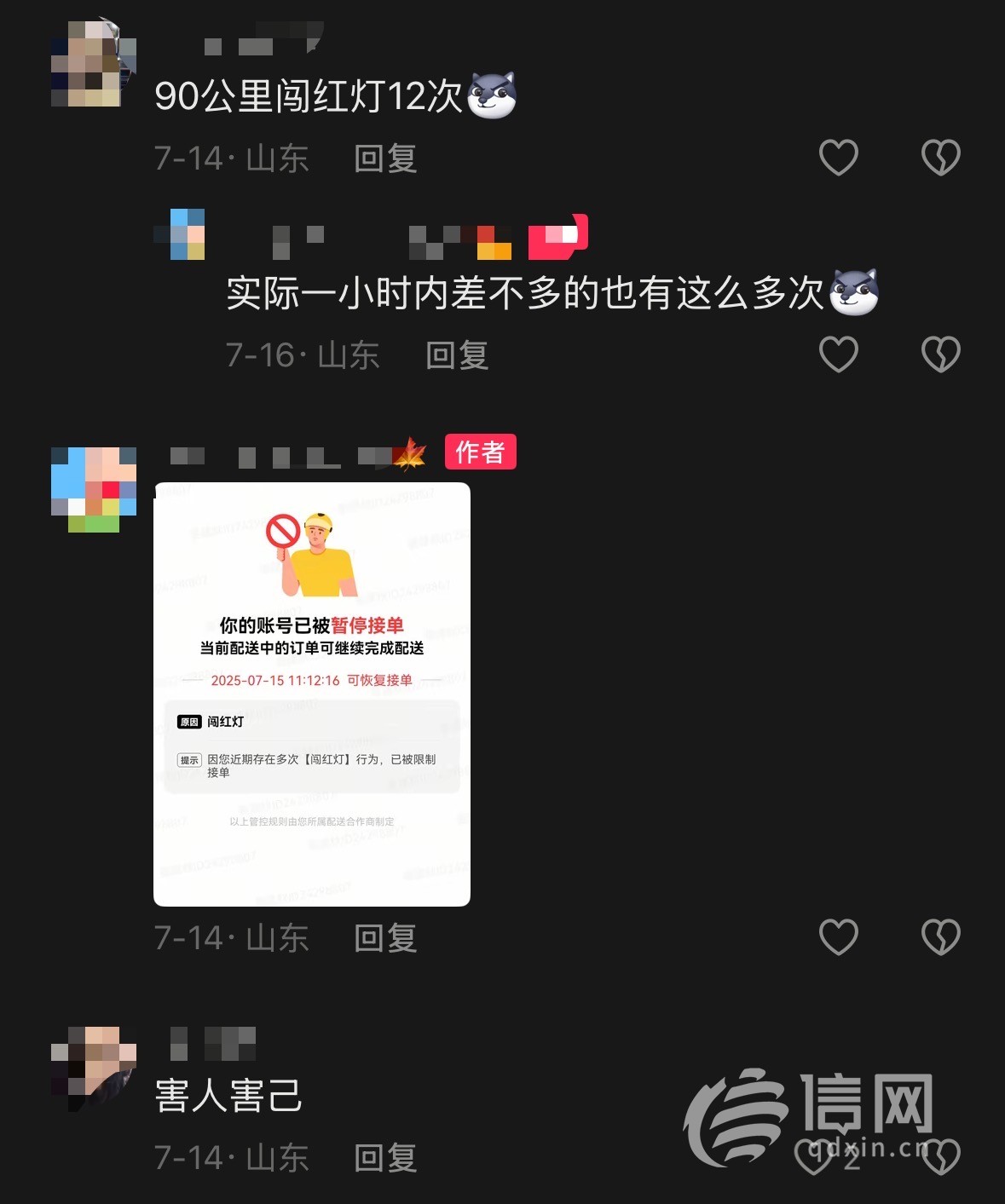 值得注意的是,信網通過查看該外賣員主頁發現,其此前主要承接美團訂單,因多次交通違規於7月15日被美團平台封號。據其他處罰記錄顯示,他曾在3天內12次闖紅燈,最終導致平台將其封禁。同為外賣員的網友指出,這樣做是一定會被封號的,而該外賣員對此回應“實際上我一個小時就能闖這麼多”。被美團封號後,他轉而加入京東快送平台。