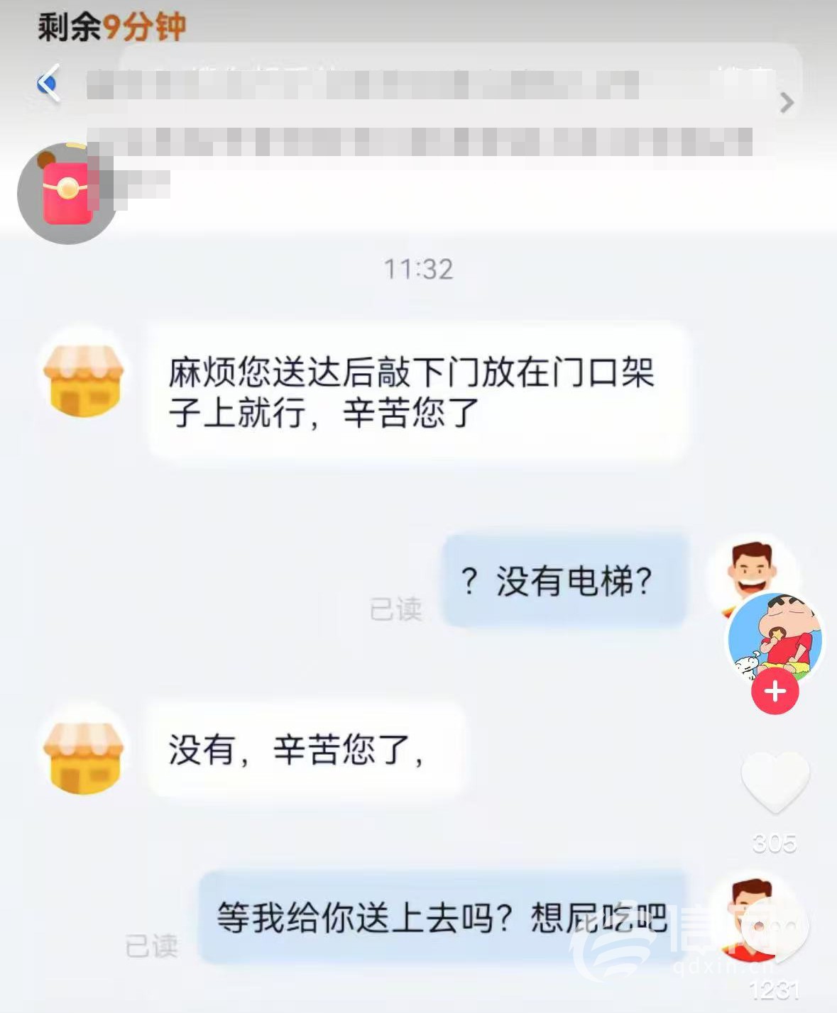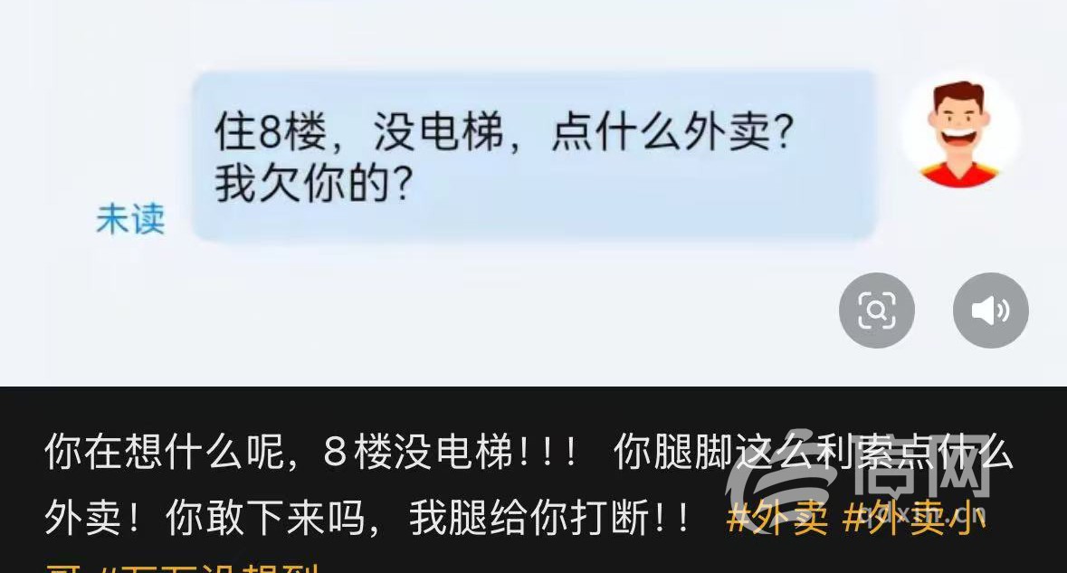 日前,青島市民劉先生向信網轉發了一段短視頻,視頻內容為一名京東平台的外賣員,因不滿一名家住李滄區的點單用户住在8樓且該小區沒有電梯,於是將其家庭住址及二人聊天記錄截圖公開,並配文“8樓沒電梯!你腿腳這麼利索你點什麼外賣!你敢下來嗎,我腿給你打斷!”
