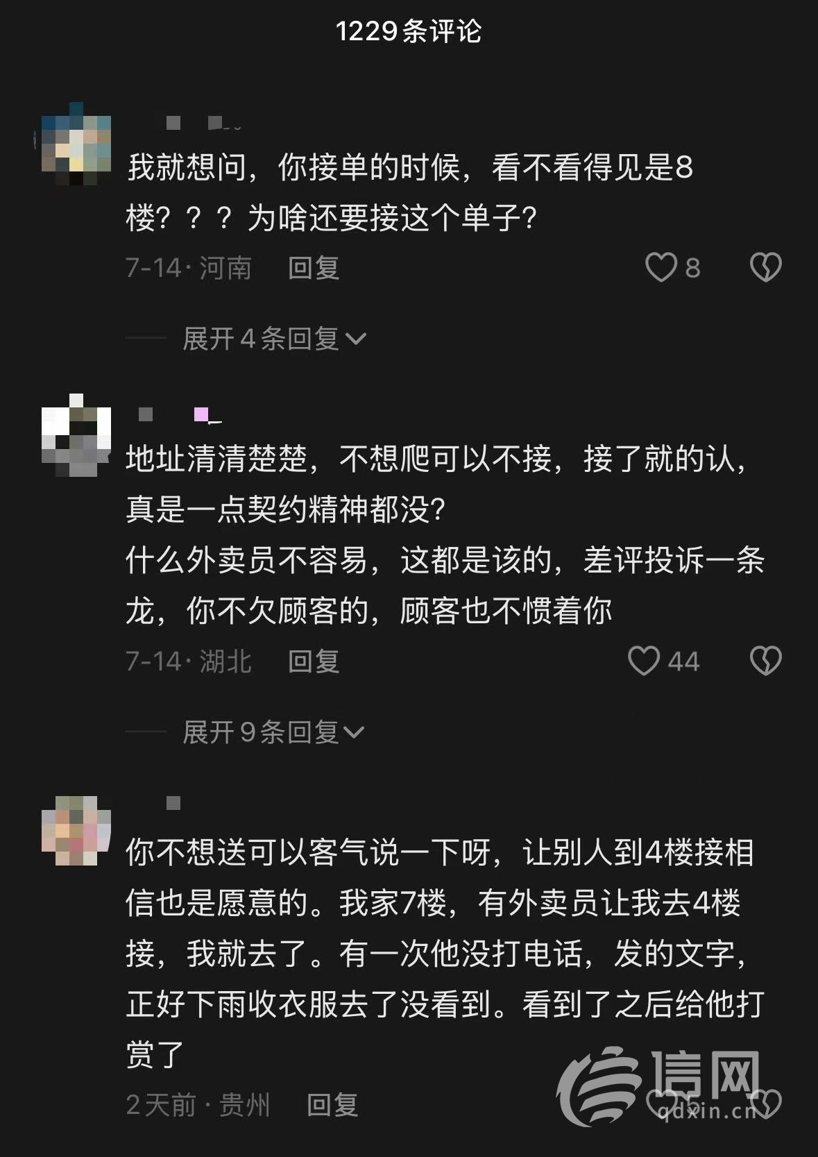 從視頻評論區來看,多數網友對該外賣員的行為表示強烈反對,主要觀點集中:無論何種原因,公開客户隱私信息並進行人身威脅,觸碰了法律與道德的雙重底線。信網注意到,評論區內還有同為外賣員的用户表示:“老樓無電梯是客觀條件,客户點餐屬於正常消費行為,外賣員接單前應預判配送難度,而非以此為由辱罵威脅。”