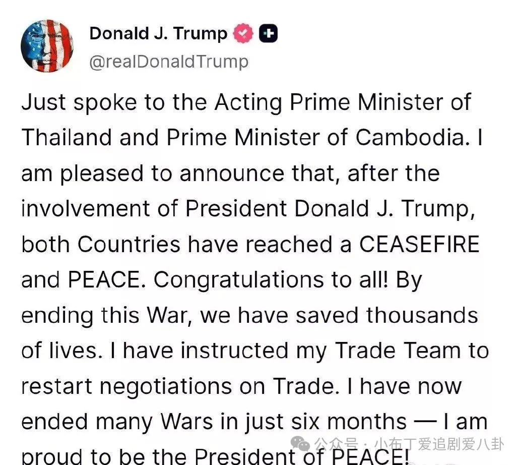 衝突爆發之後,他確實是第一時間給泰國和柬埔寨的領導人打電話,要求和談,否則就要加徵關税。