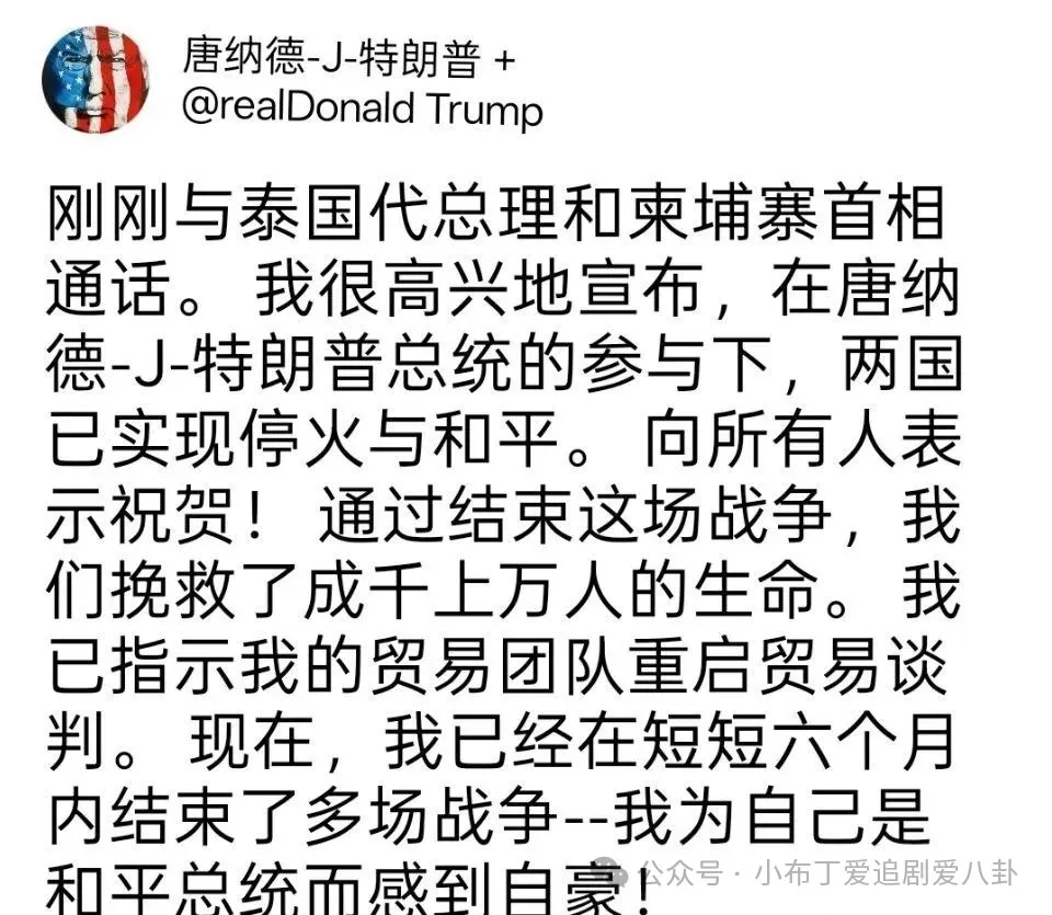 衝突爆發之後,他確實是第一時間給泰國和柬埔寨的領導人打電話,要求和談,否則就要加徵關税。
