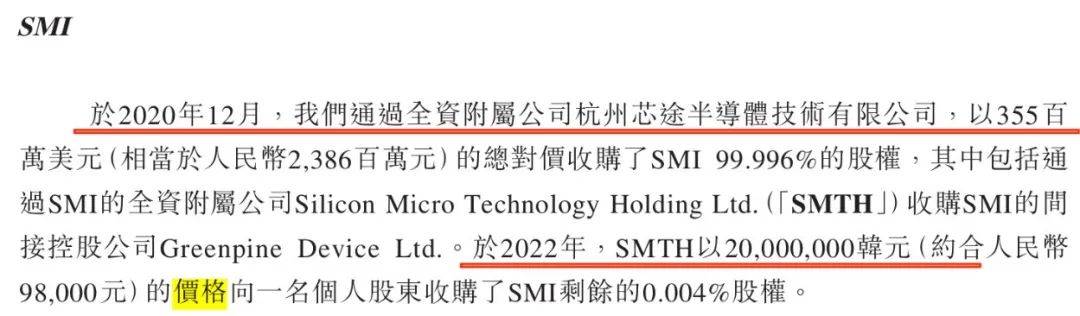 於2022年,SMTH又以2000萬韓元(約合人民幣9.8萬元)收購了SMI剩餘的0.004%股權。至此,SMI成為芯邁半導體的間接全資附屬公司。