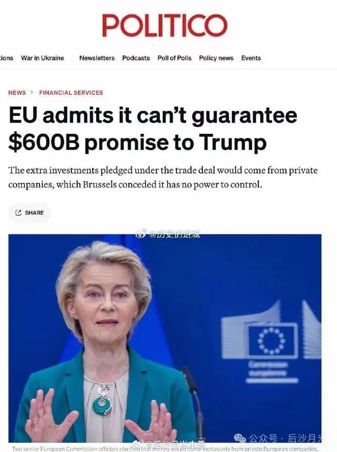 也就是説,馮德萊恩的承諾,是歐盟無法做到的,歐盟不能強迫企業去投資美國。