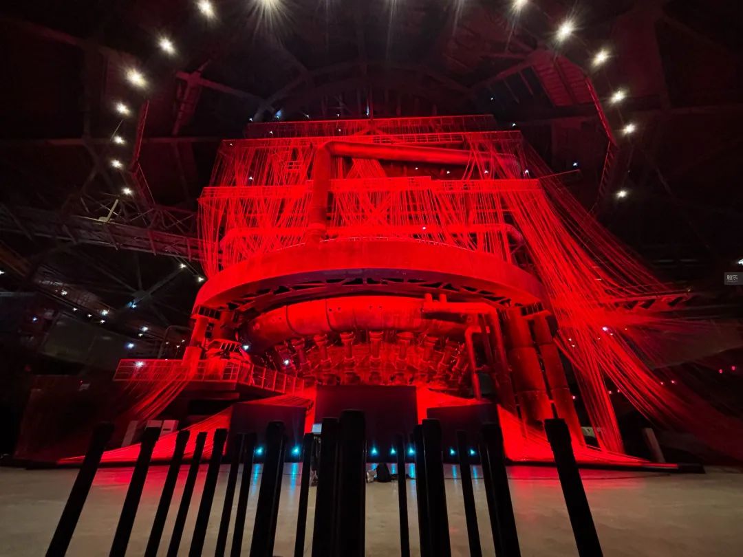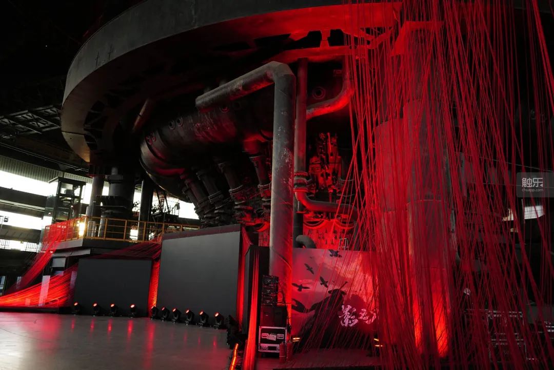 7月23日晚7點,所有的紅線都被掛好了。當天,三高爐的爐體打開燈光,一種乾淨的、高飽和的紅光映在金屬表面上,在爐體底部形成接近熔爐的色澤;在紅線掛滿後,爐體的燈光和額外被搬來的打光燈一起,把整個場地照成完全的紅色。如果你參加了這場試玩,某一些時刻抬頭,或許會錯覺顯示屏上的畫面和現場無甚區別。