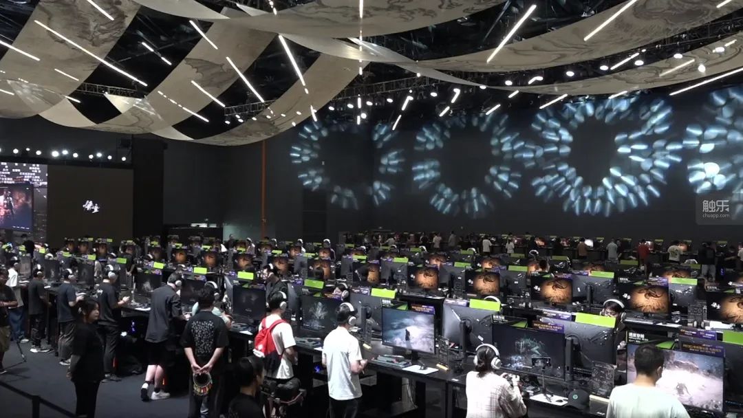 我的同事去年6月曾經參加了《黑神話:悟空》的線下試玩,他向我展示了當時的照片:一個筆直的、方型的場地,設備緊密地排布,沒有椅子,所以玩家更方便行動、更有序,看起來非常簡潔、高效。