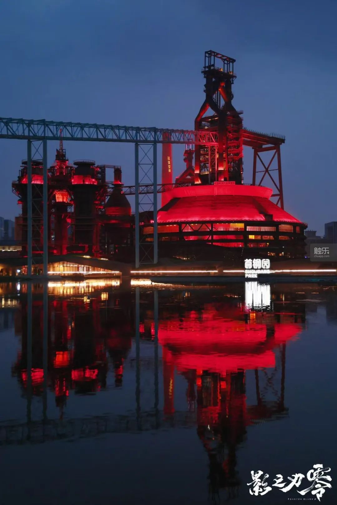 幾片紅線就從我們面前垂下。從上向下看,感覺又很是不同,這裏和施工工人所處的位置相比不算很高,但是已經給人有點驚險的感覺。晚上7點鐘,夕陽的光透過來,一種温暖的黃色,因為場館裏面的昏暗,反倒顯得格外亮——這裏可以看到西側的秀池,它同樣浮光躍金。以前它是高爐冷卻水的儲水晾水池,現在四周草地青綠,看起來像一灣美麗的小型湖泊。它的池底被改造為一塊有近900輛泊位的車庫。