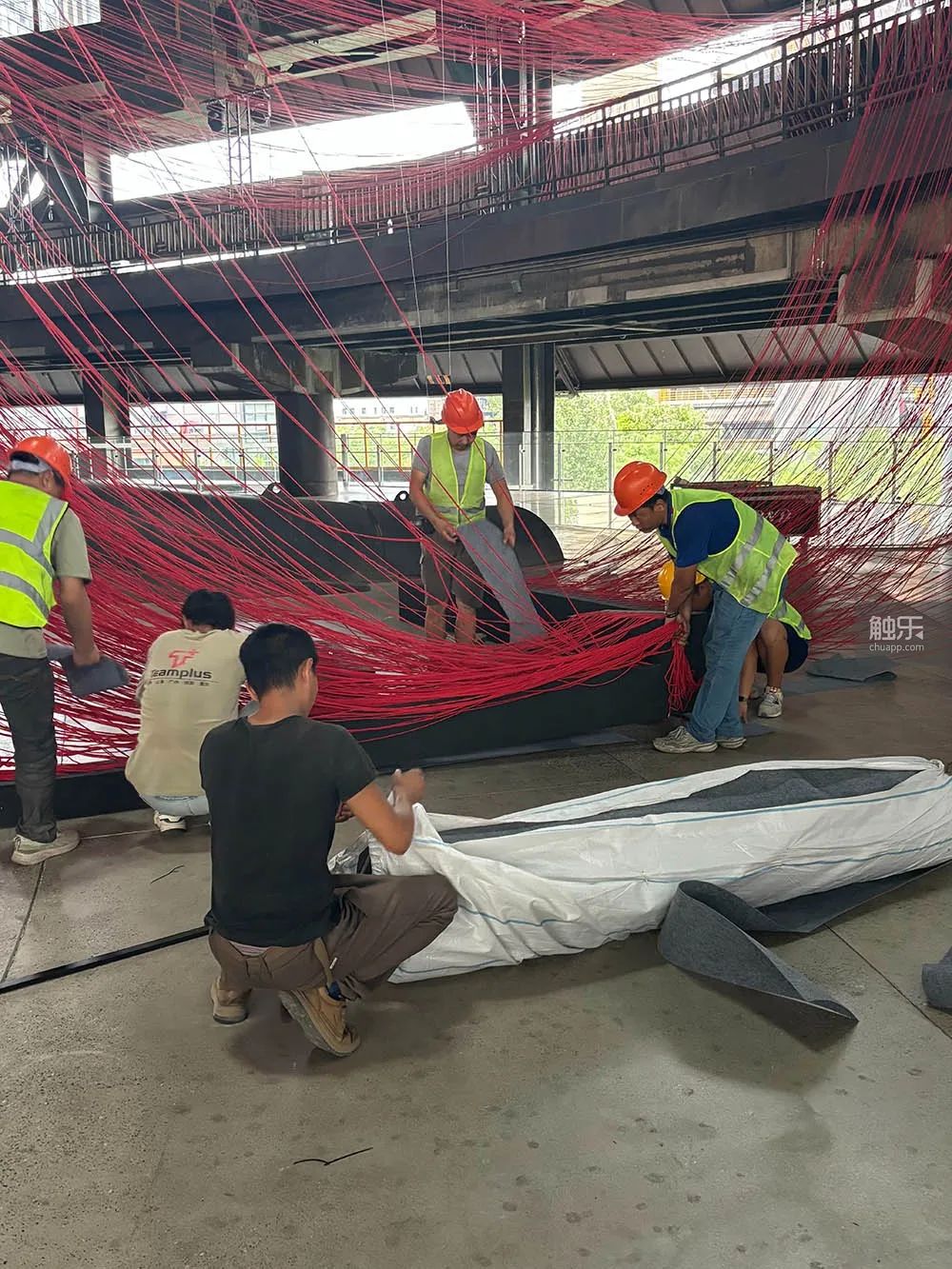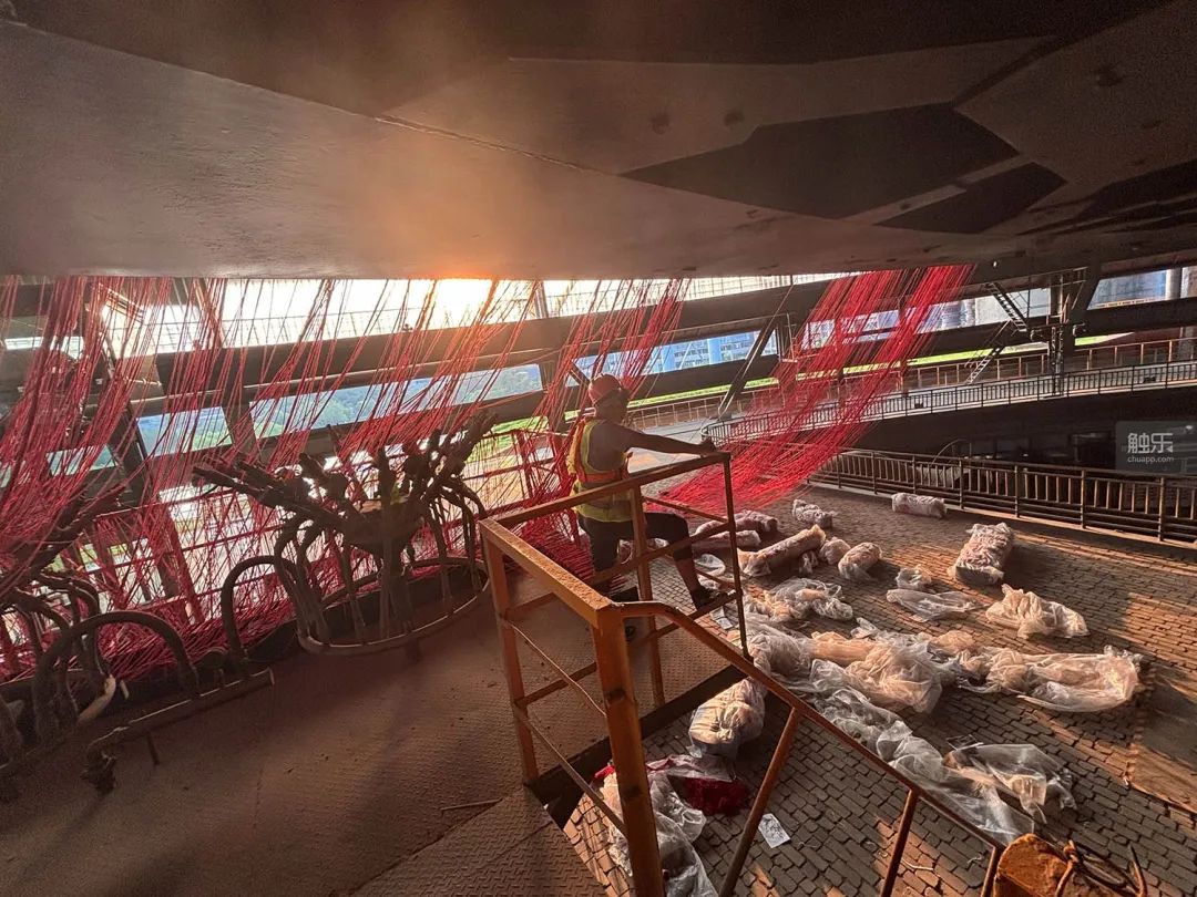 整理這些線就是工人們這兩天最主要的工作,他們要把現場的500多個模組大致放好。李增旭告訴我,“掛上去”和“調整位置”只是一個先行步驟,後面他們還要再花上1天的時間把每根線都“詳細地調一下”,有一些地方的紅線是鬆動的,有一些則要拉起來,這會讓這些紅線看起來更立體,有一種密切、自然的垂落關係。