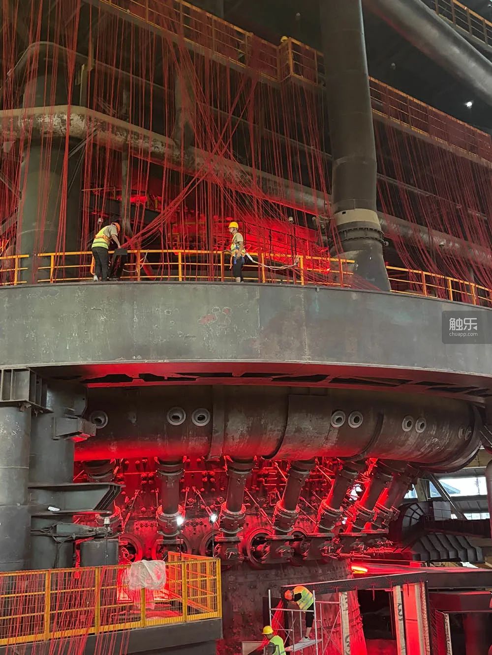 今天也非常悶熱。有風的時候還可以忍受,沒有風的時候,鋼鐵的味道似乎也更重了。李增旭帶我從平台爬上爐體側面的一個窄小的梯子,這裏能夠直接觸碰到一些粗大的運輸管道,護欄在外側。一位工人在更高些的地方拆開那些模組的包裝,白色的塑料被他用力一甩,輕柔地飄落下來。