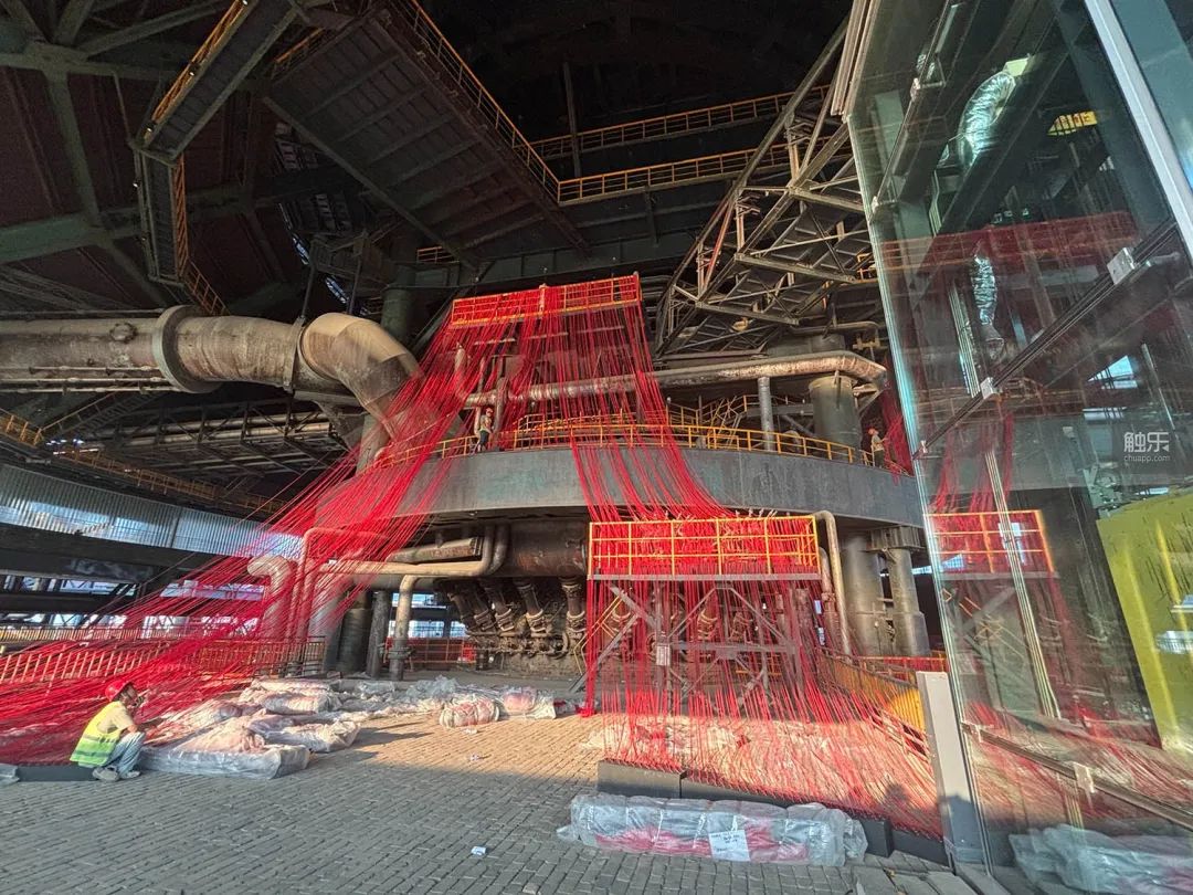 但是有些紅線已經掛好了,它們看起來有些稀疏地覆蓋了三分之一的高爐。最高的一排紅線從第二層擺動溜槽上下拉,垂出一個上窄下寬的弧度。整個場館有一種微弱的金屬腥氣,淡淡的鋼鐵的味道。現場很悶,冷風機和空調都還沒有通電。