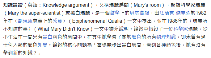 而是説,假設一個叫瑪麗的科學家,從小生活在黑白的房間裏,她學會了所謂關於顏色的知識,卻從未有過關於顏色的知覺,試問,如果她走出房間,看到五彩繽紛的世界,有沒有學到新知識?