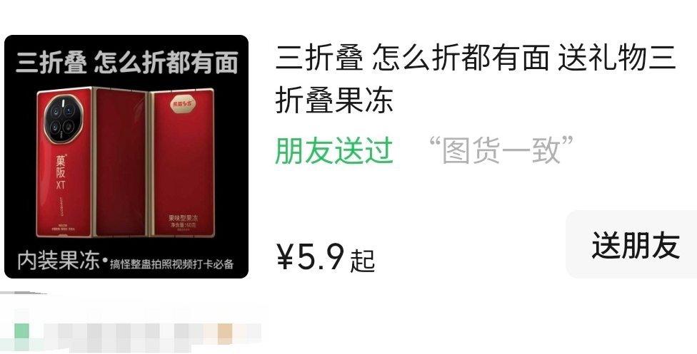 比如一款名為“三摺疊”的果凍,就是小藍包商城裏的爆款,甚至標籤和封面也喊着“怎麼折都有面”的口號。