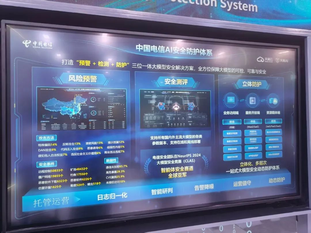 為應對大模型安全挑戰,今年4月舉行的智能雲生態大會上,中國電信曾推出基於自研的廣目資產測繪能力和靈犀網絡原生威脅情報系統,對大模型應用的互聯網暴露面進行深度掃描,識別未加密模型、數據泄露等傳統網信安全風險,為客户提供前瞻性風險預警服務。