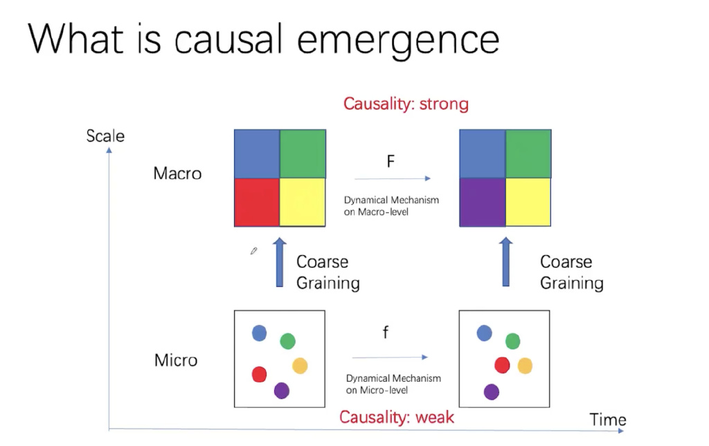 其核心亮點在於從因果的視角出發進行分析。正如之前所討論的,湧現不僅僅是一種靜態現象,更是一種動態的、存在於動力學之中的現象。這就涉及到了因果效應或因果力的問題,即系統中各個要素之間相互影響。當我們討論湧現時,它與因果視角密不可分,這是因果湧現理論的一個顯著特色。具體來説,當宏觀層面展現出更強的因果效應時,我們便認為湧現現象發生了,這也與動力學密切相關。