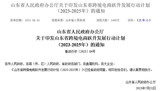 山東省跨境電商發展已形成較為完善的政策體系。自2015年起,山東省政府先後出台《山東省跨境電子商務發展行動計劃》《山東省跨境電子商務等新業態提升發展行動計劃》等政策文件,持續推動跨境電商快速發展。2023年7月,山東省人民政府辦公廳印發《山東省跨境電商躍升發展行動計劃(2023-2025年)》,提出"打造20個跨境電商特色產業帶,培育100個具有較強國際競爭力的跨境電商知名品牌,孵化1000家跨境電商新鋭企業"的戰略目標。