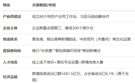 其他城市:濟南(紡織、汽車配件)、淄博(陶瓷)、聊城(軸承、紡織品、寵物食品等)等城市也形成了各具特色的跨境電商產業帶。