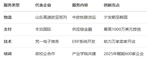**服務商類型:**包括物流服務商(如山東高速齊魯號歐亞班列)、支付服務商(如豐泊國際)、營銷服務商(如海鳥跨境)、技術服務商(如山東梵一電子商務有限公司)等。