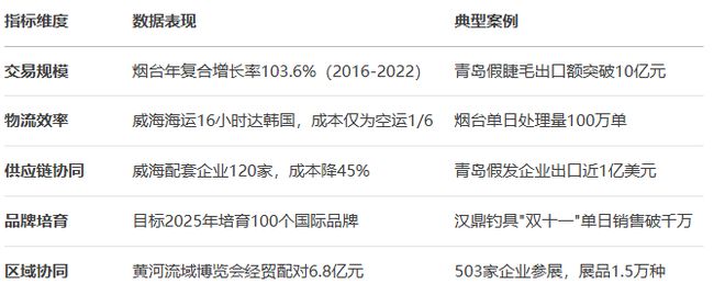 交易規模增長:青島假睫毛產業帶2023年出口額突破10億元;煙台跨境電商進出口額從2016年的8.8億元增長到2022年的620億元,年複合增長率達到103.6%。