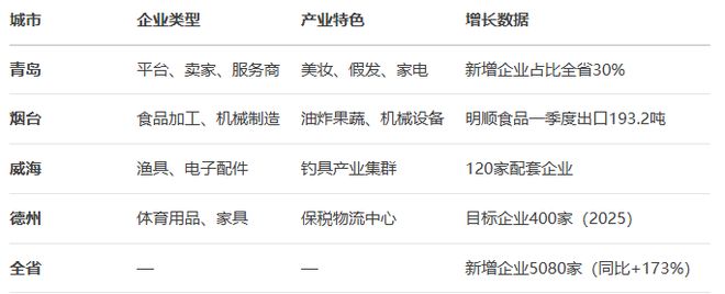 區域分佈:青島作為跨境電商綜試區,企業數量最多,涵蓋多個產業領域;煙台依託食品、機械等產業優勢,形成特色企業集羣;威海漁具產業帶企業通過跨境電商實現全球銷售;德州體育用品產業帶企業數量快速增長,力爭到2025年突破400家。