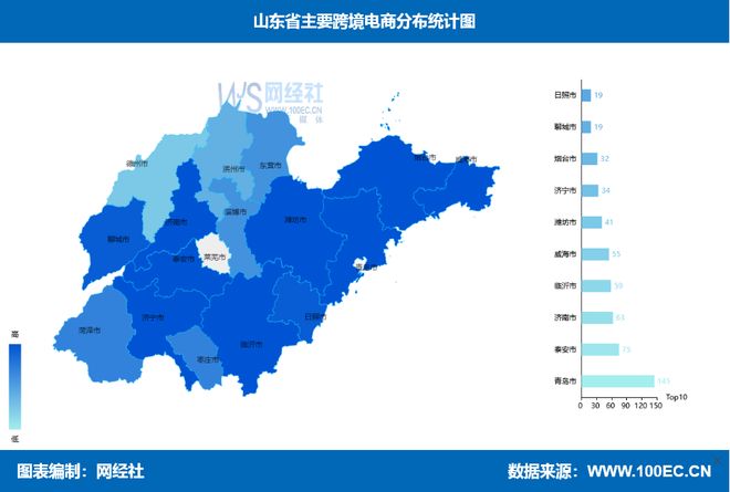 山東省主要跨境電商有607家,其中主要分佈在青島市共有145家,剩餘分佈在泰安市、濟南市、臨沂市、威海市、濰坊市、濟寧市、煙台市、聊城市、日照市等地。