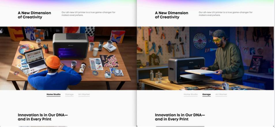 當一個產品有五到六種功能時,要有一種科學的展示。比如eufyMake這款打印機,有五個場景可以使用,第一個場景是打印杯子;第二個是打印畫冊甚至是立體畫;第三個是打印小物件,比如手機殼;第四個是打印可摺疊可變形的畫,能夠貼在車子或者滑板上;第五個是直接打印貼紙。eufyMake在每一個場景裏都展示了四張圖,一下子就告訴那些想要進行二次創作的人,其實有非常多的創意可做,從而能夠不斷突破產品的使用邊界。