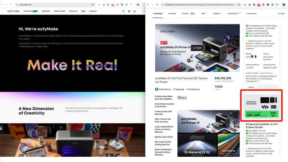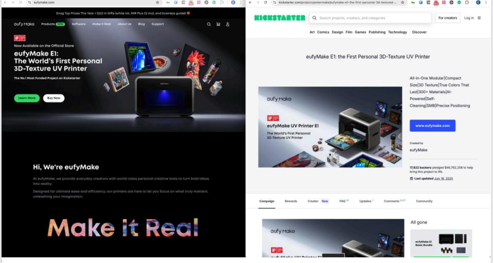 6月底,eufyMake推出全球首款消費級3D紋理UV打印機E1,在眾籌平台Kickstarter收官,兩個月時間內獲得4676萬美元的眾籌金額和17822名全球支持者,刷新平台有史以來全品類最高眾籌紀錄。