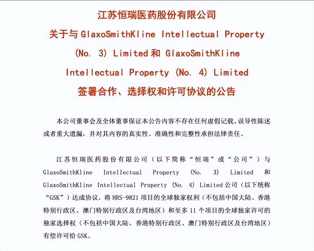 7月28日,#恆瑞醫藥 發佈公告,將HRS-9821項目的全球獨家權利(不包括中國大陸、香港特別行政區、澳門特別行政區及中國台灣地區)和至多11個項目的全球獨家許可的獨家選擇權(不包括中國內地、中國港澳地區和中國台灣地區)有償許可給跨國藥企葛蘭素史克GSK。