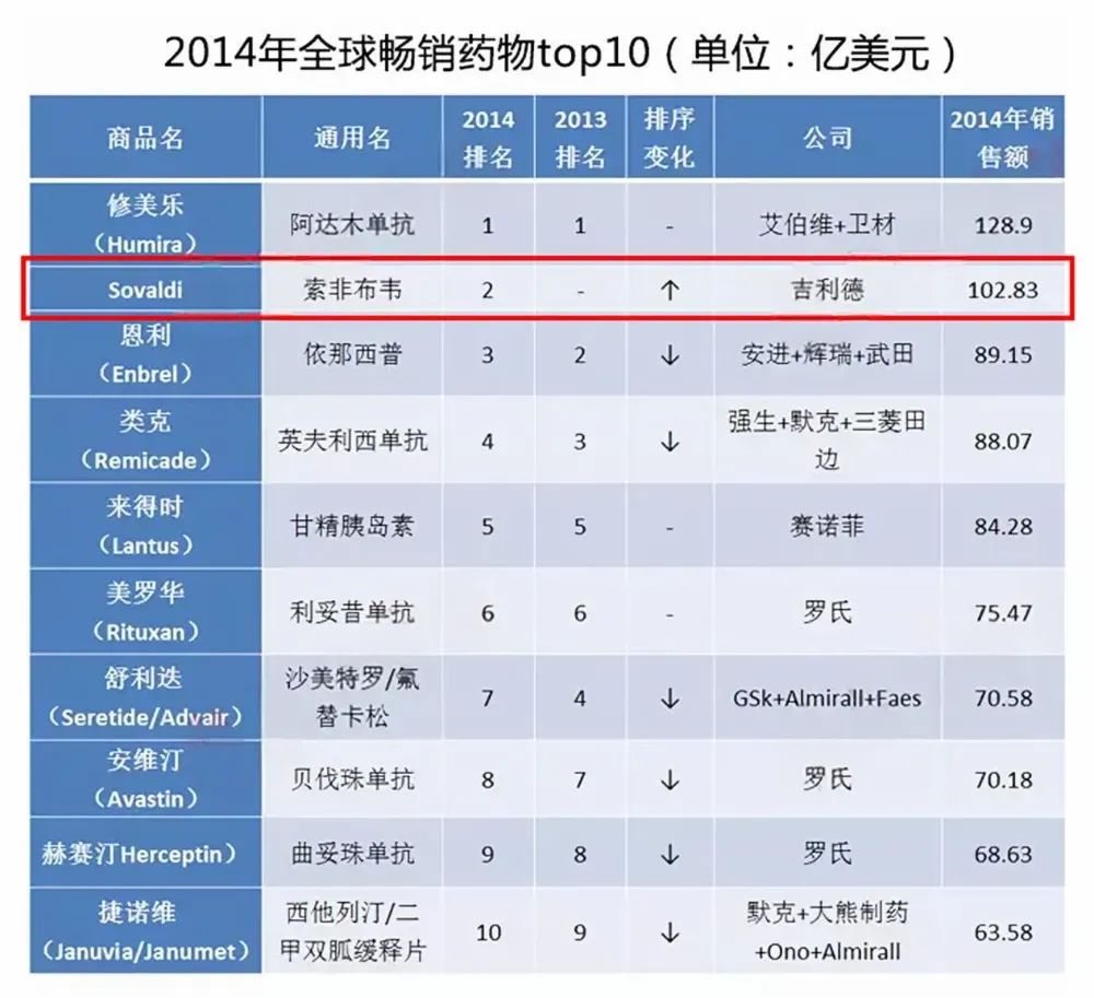 2年後,Pharmasset公司的Sovaldi產品上市,當年即有1.39億美元的收入,2014年創下102.83億美元的年銷售額。