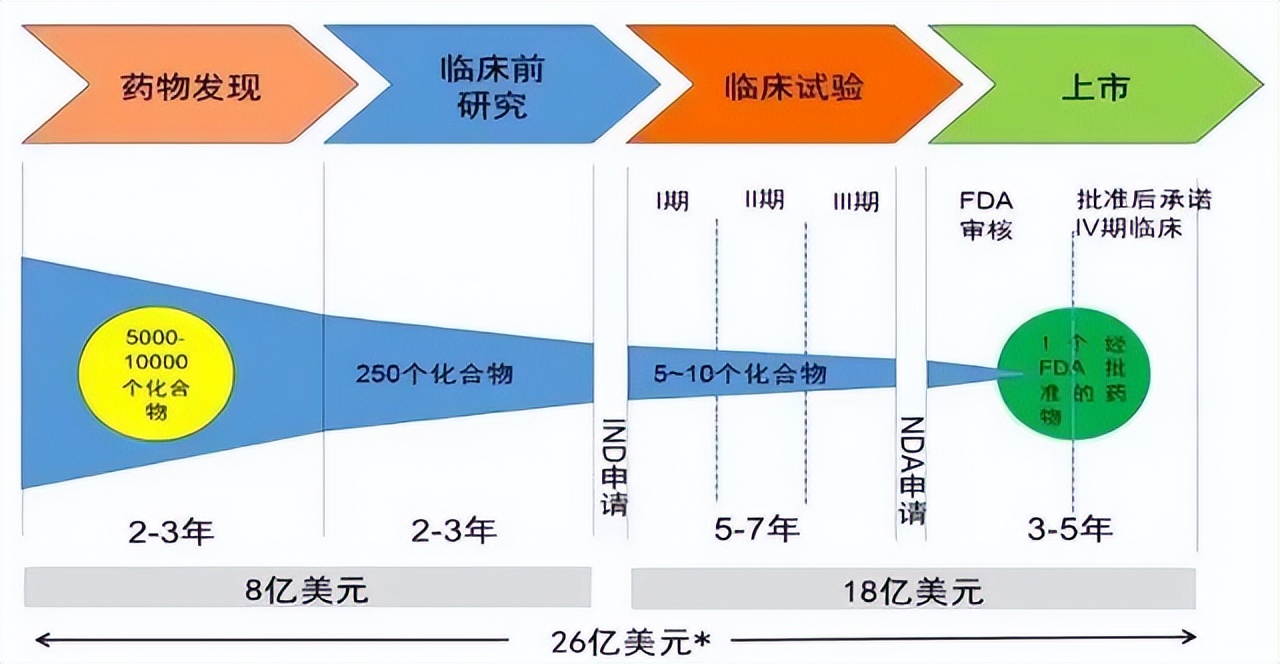 一款創新藥從早期研發到最終上市,平均需10-15年週期,投入20-30億美元,且臨牀階段成功率不足10%。