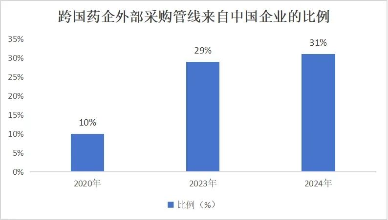 一位醫藥人士在近期的公開會議上分享了一組數據:跨國藥企外部採購管線來自中國企業的比例逐年上升,2020年為10%,到了2023年達到29%,2024年這一比例達到31%。