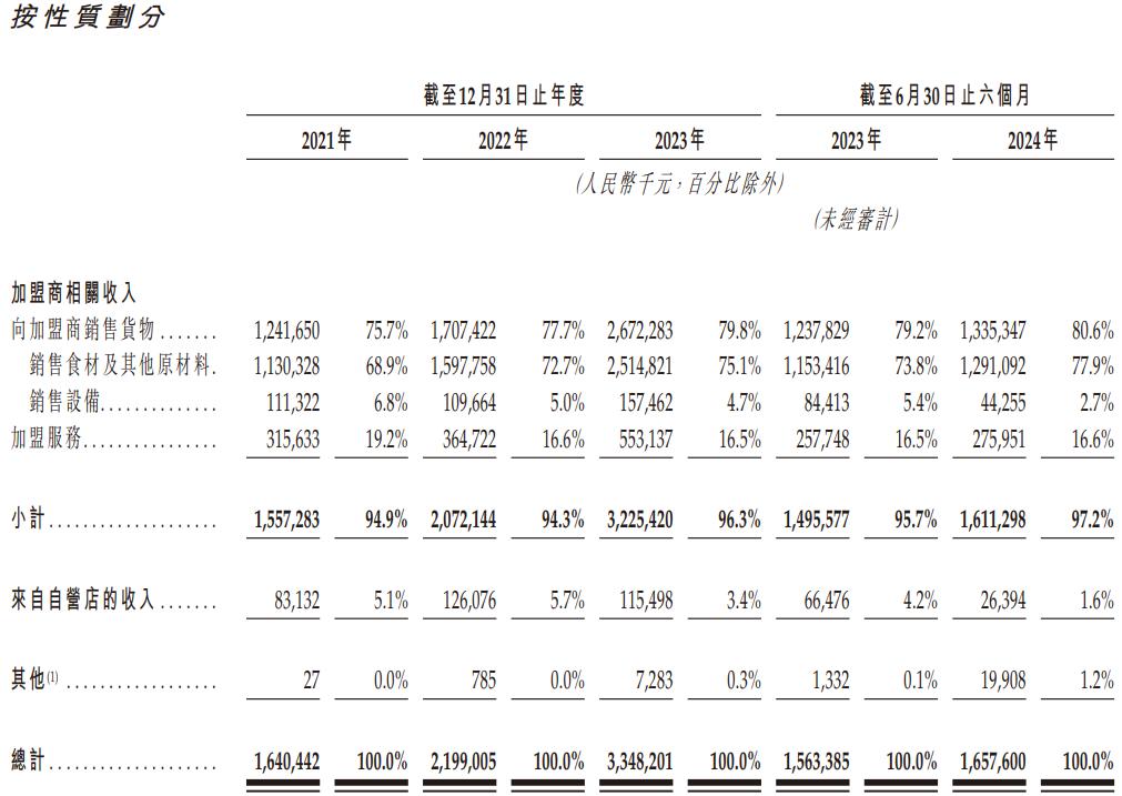 2024年,滬上阿姨96.5%收入來自加盟商,其中食材銷售佔比80.1%,加盟服務收入佔比16.4%,自營店收入僅佔1.5%。