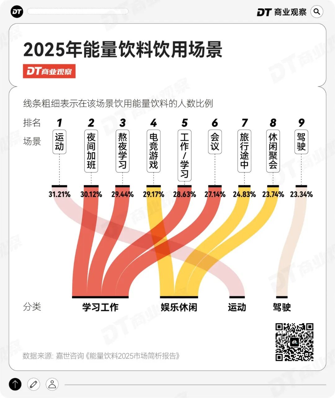 根據嘉世諮詢《能量飲料2025市場簡析報告》,現在人們飲用能量飲料最常見的場景TOP 3分別是:運動(31.21%)、夜間加班(30.12%)、熬夜學習(29.44%)。