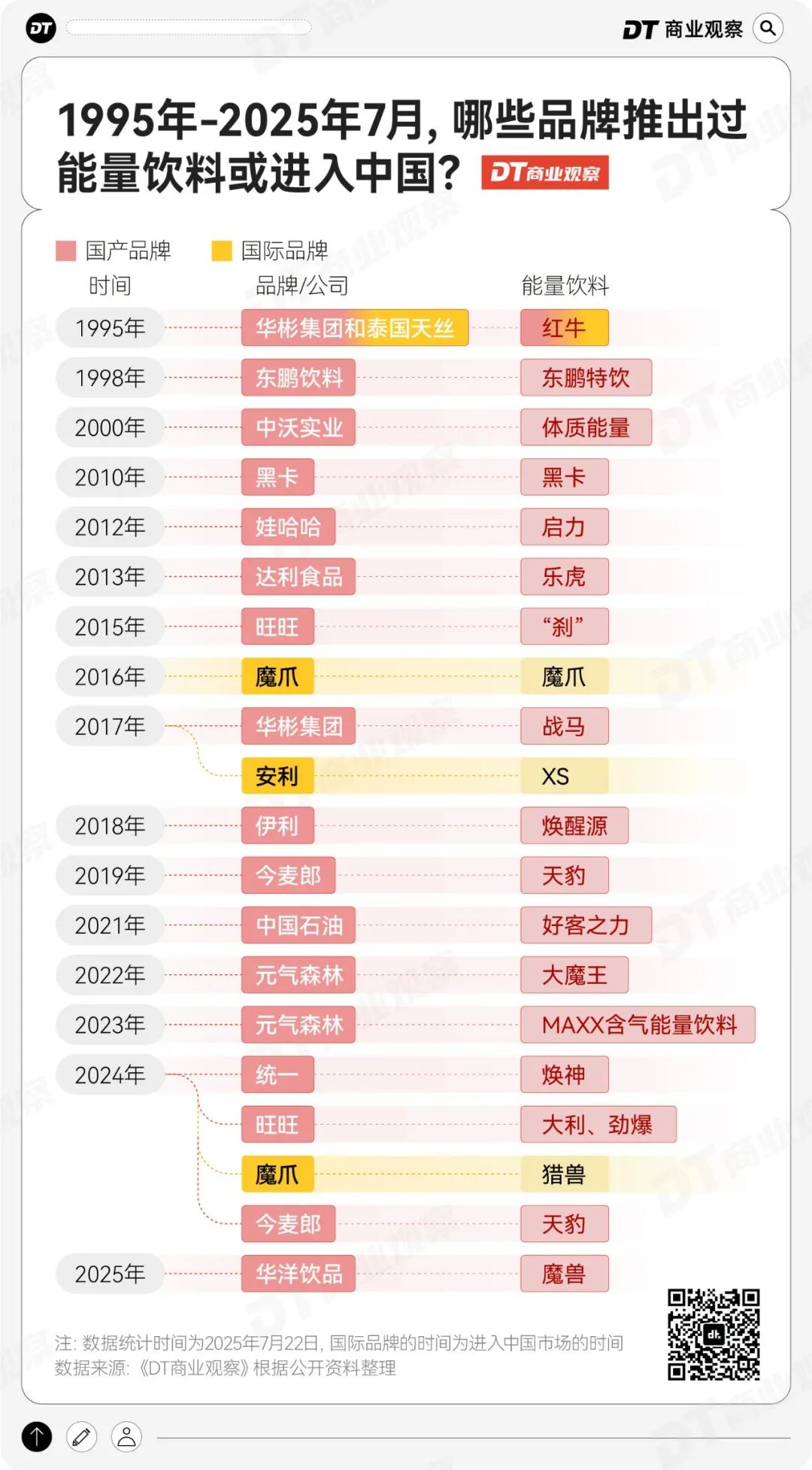 1995年,紅牛(華彬集團和泰國天絲聯合推出的,後來這兩家公司“分家”)進入中國,把“能量飲料”這個新物種帶到中國。此後的20多年中,一大批國產品牌爭相入場。