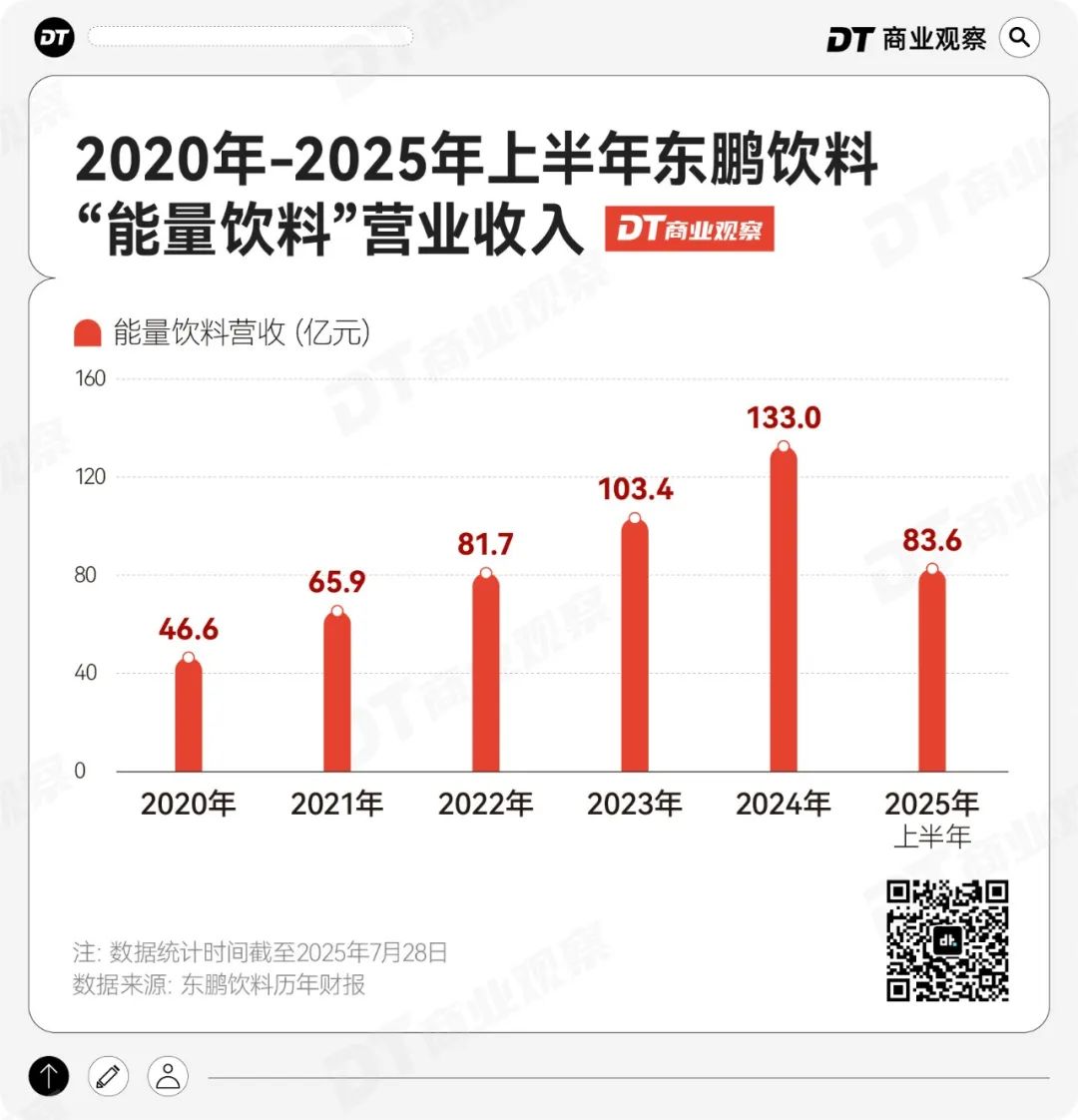 7月26日,東鵬飲料發佈2025年半年報,半年營業收入破百億元,同比增長36.37%,其中大單品“東鵬特飲”連續5年增長,今年上半年,已經賣出了83.6億元。