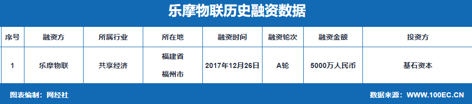 據網經社旗下電商大數據庫“電數寶”監測數據顯示,2017年12月26日,福建樂摩物聯科技股份有限公司(簡稱:樂摩物聯)完成A輪5000萬人民幣融資,投資方為基石資本。