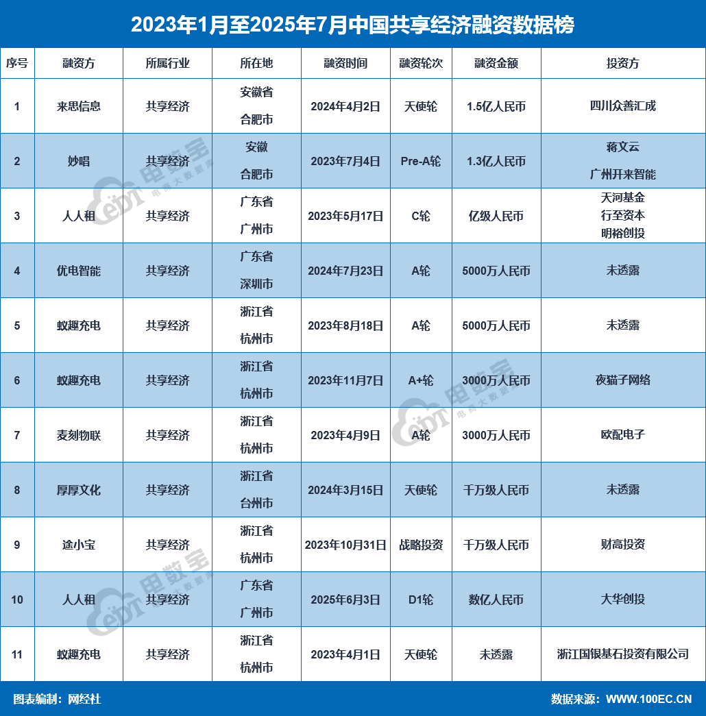 2023年1月至2025年7月中國共享經濟融資數據榜顯示,來思信息、妙唱、人人租、優電智能、蟻趣充電、蟻趣充電、麥刻物聯、厚厚文化、途小寶、人人租、蟻趣充電等企業進行了融資。