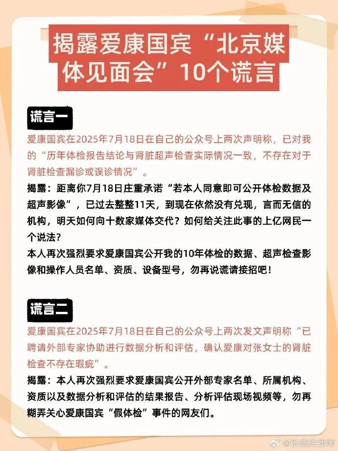 5、在此次媒體説明會前一天,涉事律師張曉玲已經在7月29日深夜通過微博發佈了揭露愛康國賓“北京媒體見面會”10個謊言,稱自己不出意外地被排除出邀請名單之列。她用多張圖,逐個説明了當前外界關注的問題。