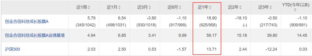 近1年,全市場超額收益排名倒數第一的基金是創金合信科技成長。雖然其近1年業績還不錯,達到了18.90%,但它的業績基準——中證高新技術企業指數同期大漲了59.17%,兩者之間拉開了40.26%的巨大鴻溝。