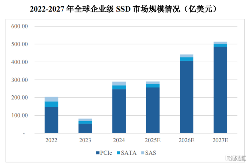 根據相關數據統計,2022年,全球企業級SSD市場規模為204.54億美元,並將隨着存儲行業需求提振不斷增長,預計2027年市場規模將達到514.18億美元,年複合增長率達到20.25%。