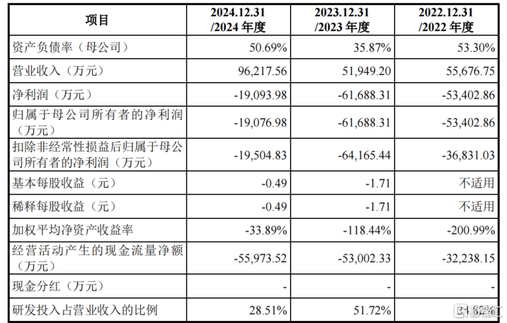 2022年、2023年、2024年(報告期),公司的營業收入分別為5.57億元、5.19億元、9.62億元,歸母淨利潤分別為-5.34億元、-6.17億元、-1.91億元,3年累計虧損超13億元。