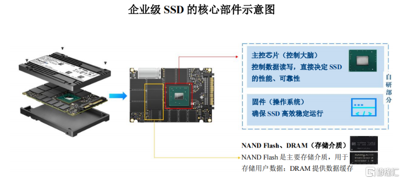 企業級SSD由固態電子存儲芯片陣列製成,核心部件包括主控芯片、固件和存儲介質(NANDFlash、DRAM),其中主控芯片和固件直接決定企業級SSD的性能和可靠性等產品表現。