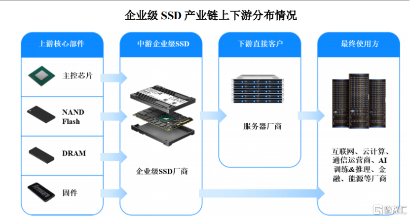 企業級SSD是半導體存儲行業中的連接橋樑,位於產業鏈的中游;其上游主要是存儲介質製造商、主控芯片設計廠商,下游主要是AI、雲計算、大數據等數據中心。