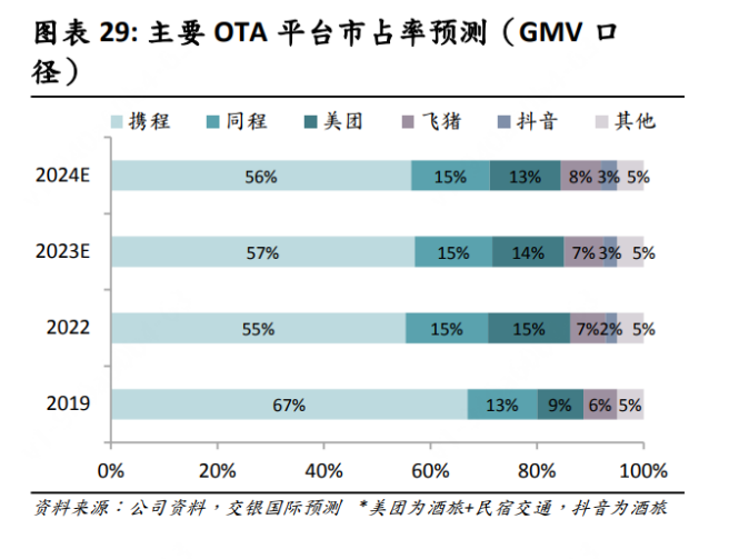 最後,在這個市場空隙中,也藏着誘人機會。根據交銀國際研報預測,2024 年國內OTA市場中,攜程、同程、美團、飛豬、抖音的市佔率,分別為56%、15%、13%、8%、3%。