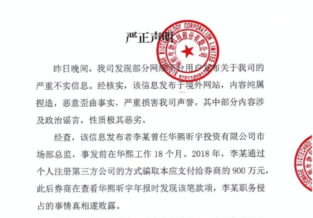 據華熙生物方面所述,2018年李某騙取公司支付給券商的900萬元,後由公安機關立案;而為了減輕罪責,李某也寫了一封道歉信,該信件被附於聲明之後。在李某的道歉信中,其承認私設公司拿獎金,並答應退回900萬元,並另付150萬元作為賠償。