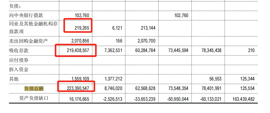 同業的嗅覺是最靈敏的,於是遼瀋銀行2024年末的“同業及其他金融機構存放款項”下降至2.2億元,佔負債比例不足千分之一,較上年下降超90%;超過2233.91億元的負債,核心構成是吸收存款,金額達到2194.39億元。