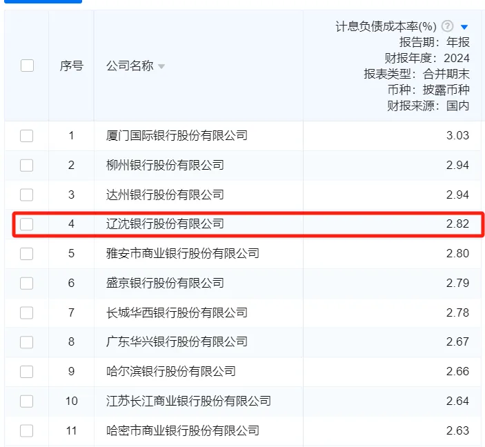 答案是高息攬儲,企業預警通數據顯示,2024年遼瀋銀行計息負債率為2.82%,在城商行中位居第四。(儲户不用過分緊張,50萬元以下的存款,都有存款保險託底。)