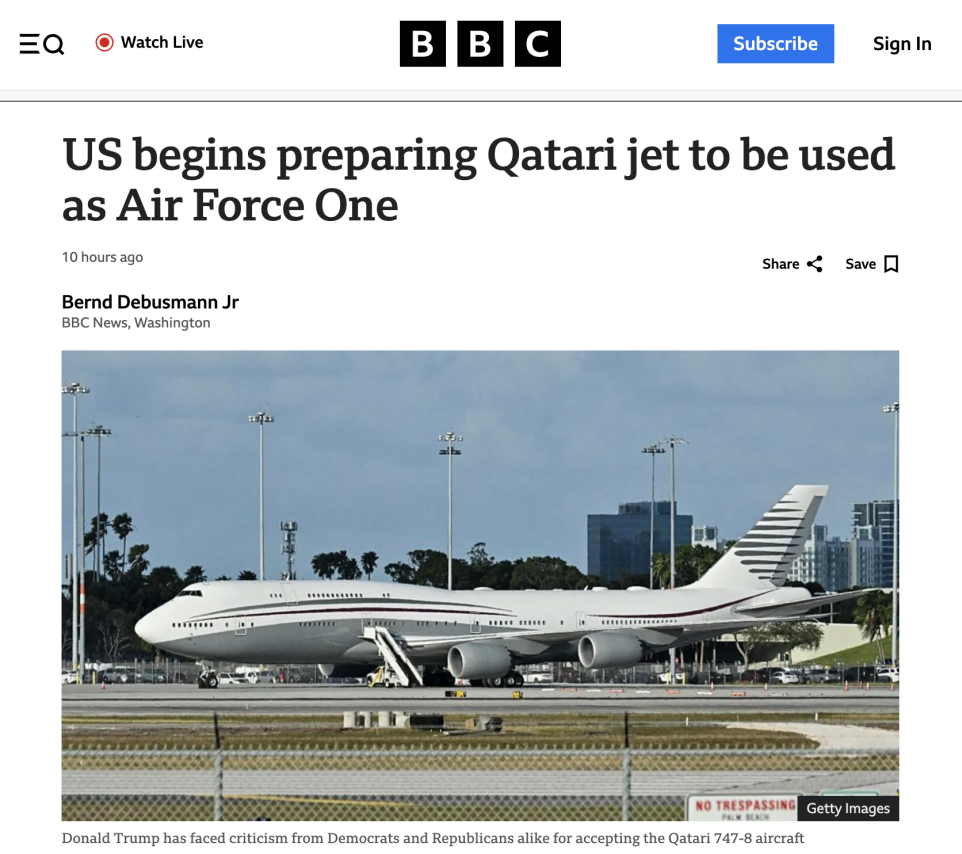 先説特朗普的這個專機,其實這架卡塔爾送給特朗普的747-8。雖然説是今年5月份特朗普訪問中東的時候,走了個程序正式贈送給美國的。而且還按照相關程序,先贈送給美國國防部,再由總統圖書館基金會接收。