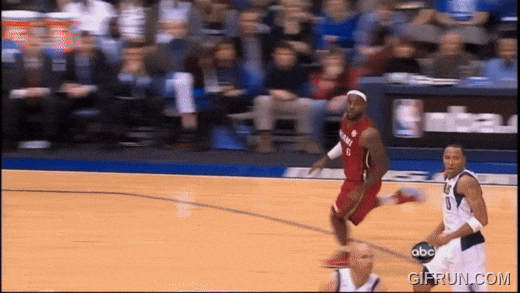 而他最神奇的一個空接,我覺得是當年在邁阿密的一個:2011年總決賽熱輸給達拉斯後,那年冬天常規賽,熱決意復仇。比賽中,勒布朗一個反擊,從馬里昂身後起跳,接高拋傳球——然後往下一拍,韋德跟進,空接扣籃。