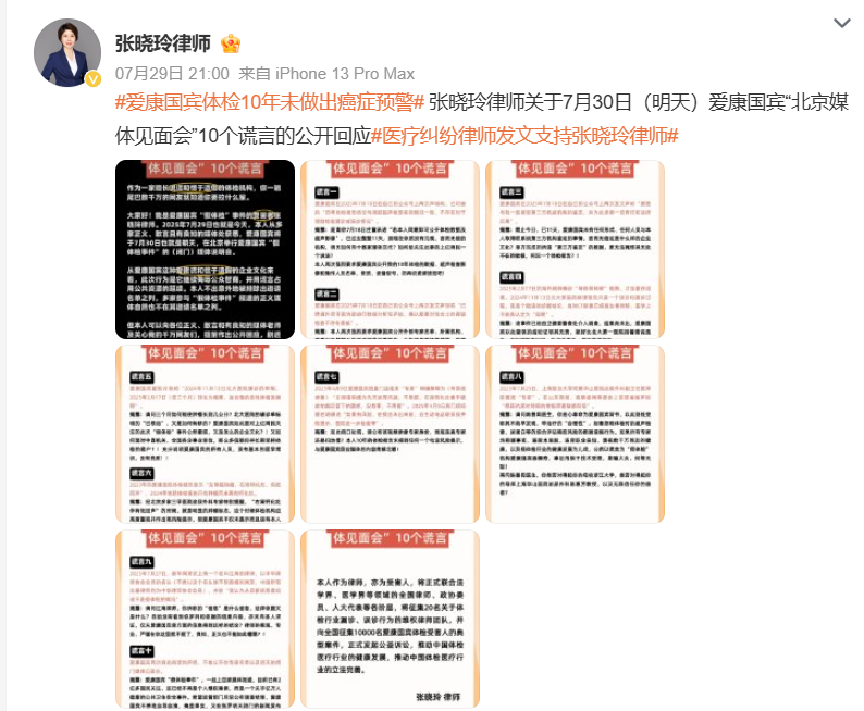 在愛康集團媒體説明會前一天,張曉玲在微博上發佈了對愛康國賓早前發佈有關“假體檢”回應聲明的質疑。