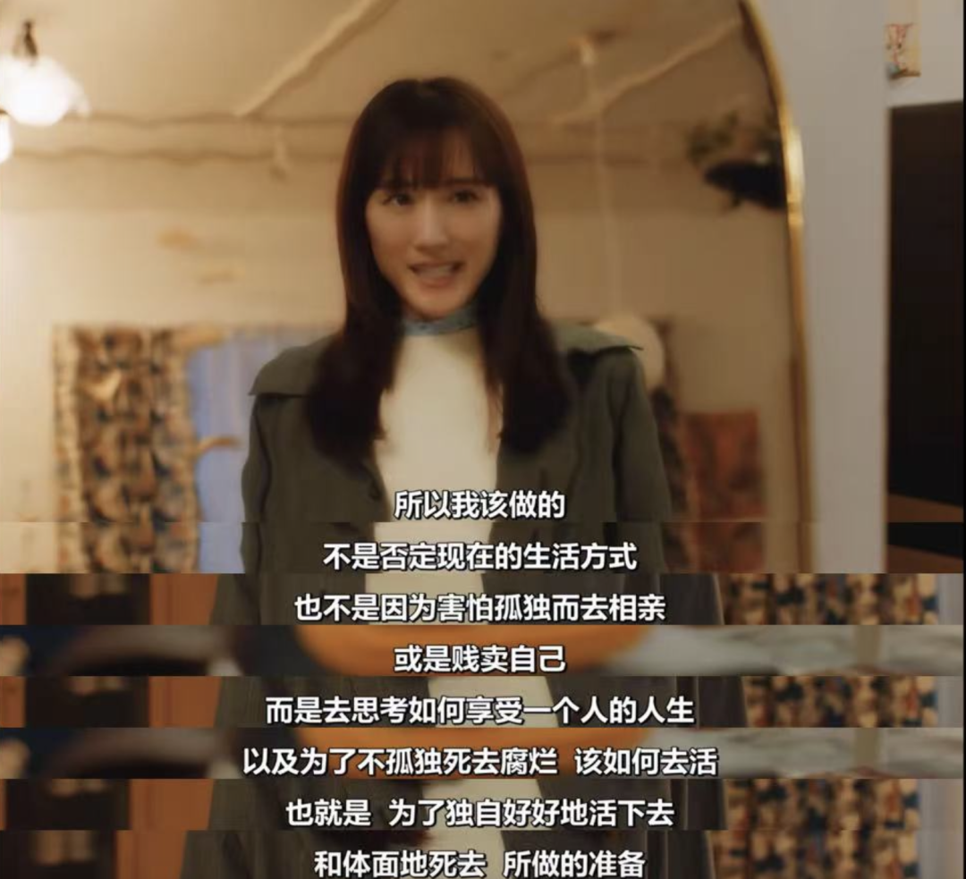 她為自己的獨立體面付出了巨大努力,但在別人眼裏她就是一個悲慘死去的孤獨女人。她生前所有的成就、努力、對自我道路的堅持,在孤獨死麪前,瞬間被消解。